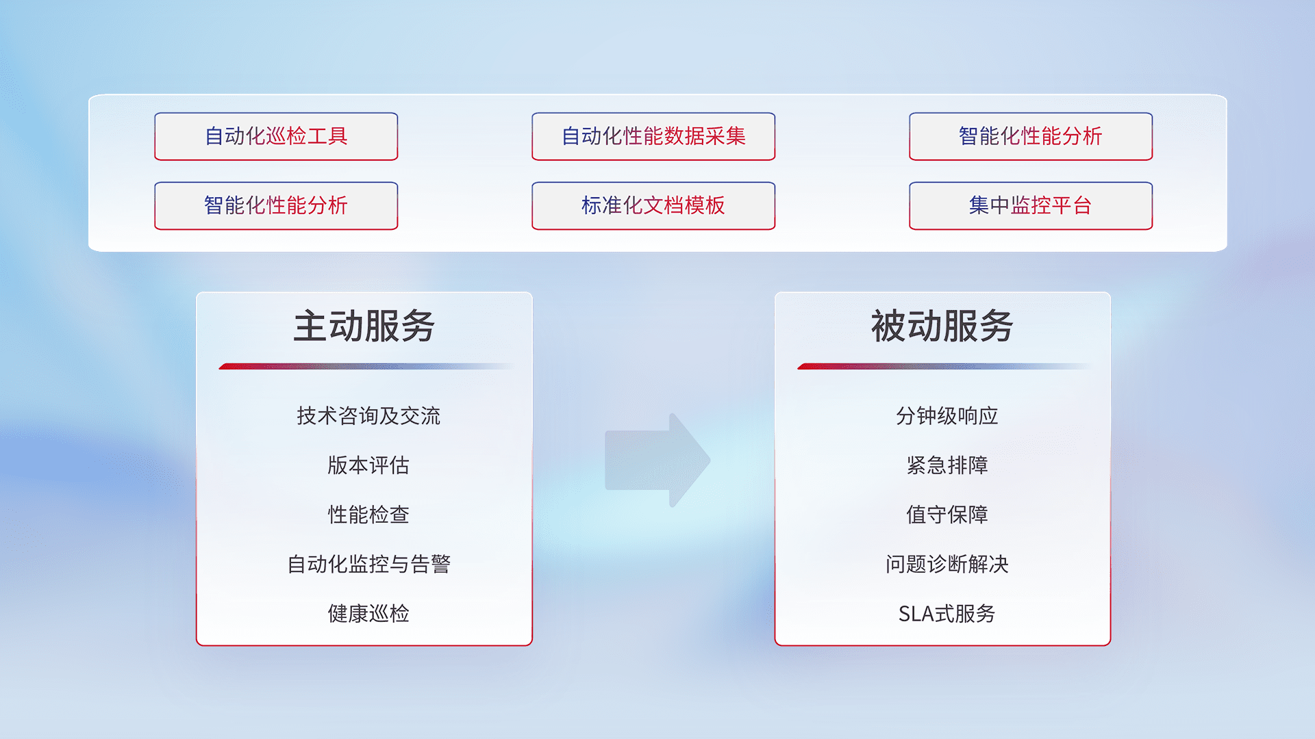 智能化工具和标准化文档,,,,保障服务质量,,提供主动服务(包含技术咨询、、、、版本评估、、性能检查、、、自动化监控与告警、、健康巡检)和被动服务包含(分钟级响应、、、紧急排障、、、、值守保障、、、问题诊断解决、、SLA服务)。。。。